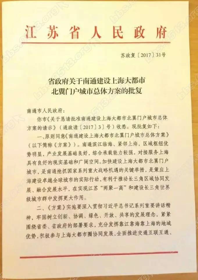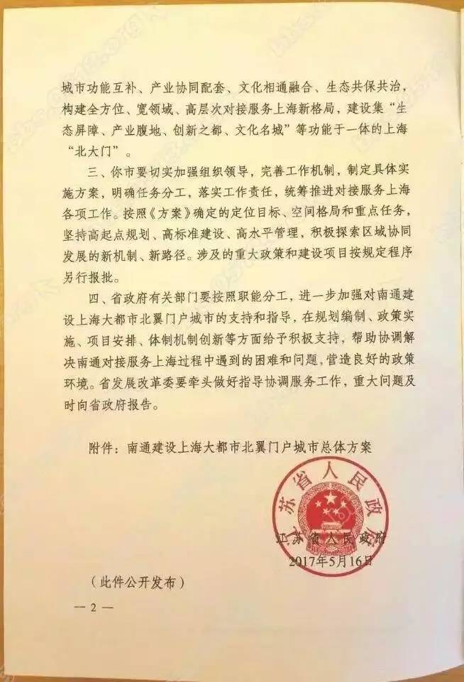 5月16日,“苏政复〔2017〕31号”《省政府关于南通建设上海大都市北翼门户城市总体方案的批复》文件出台,同意南通建设上海北翼门户城市。